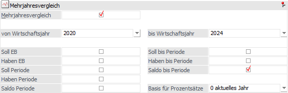 Der Mehrjahresvergleich ermöglicht es die Daten von bis zu 5 aneinander folgenden Wirtschaftsjahren zu vergleichen. Diese Auswertung kann nach mehreren Selektionskriterien eingeschränkt werden.