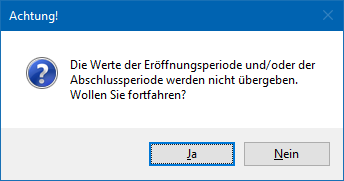Bei Erstellung der Datei wird geprüft, ob die Ausgabe inklusive Eröffnungs- und / oder Abschlussperiode erfolgt. Falls eine der Checkboxen nicht gesetzt ist, erfolgt eine entsprechende Hinweismeldung: