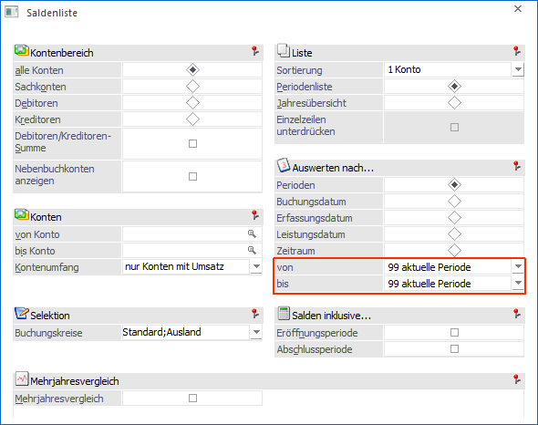 Die Optionen für Eröffnungs- und Abschlussperiode stehen nur bei der Auswertung der Periodenliste zur Verfügung.