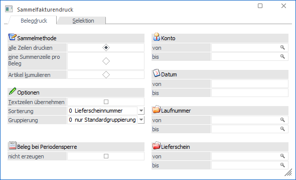 In dem Register "Belegdruck" können Selektionen und Einstellungen für den Druck der Sammelfakturen vorgenommen werden. Die getätigten Eingaben wirken sich direkt auf das Register "Selektion" aus.