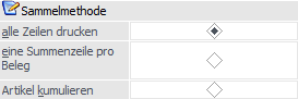 In diesem Bereich kann definiert werden, wie die Ausgangsbelege auf der Sammelfaktura ausgewiesen bzw. zusammengefasst werden sollen. Folgende Varianten stehen zur Verfügung: