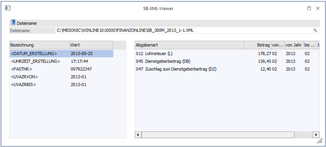 Nach Eingabe des Dateinamens (der auch mittels Matchcode gesucht werden kann) werden in der Tabelle die Werte der allgemeinen "Tags" wie Erstellungsdatum, Finanzamt-Steuernummer, oder UVA-Zeitraum angezeigt. Die einzelnen Abgabenarten mit den entsprechenden Werten werden im rechten Teil des Fensters dargestellt.