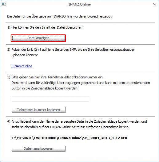 Dieser Menüpunkt - dieses Fenster - kann auch geöffnet werden, indem im Fenster "FINANZOnline" der Button "Datei anzeigen" gewählt wird.