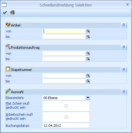 Einschränkung auf eine Stapelnummer (von-bis), die endgemeldet werden soll. Der Stapelnummer-Matchcode steht zur Verfügung.
