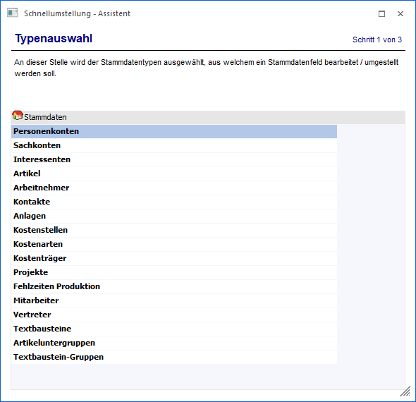 Im 1. Schritt muss der Datentyp gewählt werden, für welchen die Stammdatenfelder geändert bzw. neue Werte vergeben werden sollen. Hier stehen alle Stammdaten zur Verfügung, für die es Vorlagen oder Eigenschaften gibt.