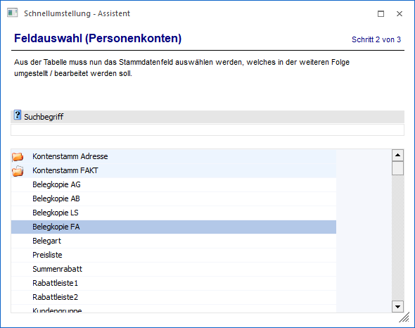 Im 2. Schritt kann entschieden werden, welches Stammdatenfeld beim gewählten Stammdatenobjekt verändert werden soll. In der Tabelle werden alle Datenfelder in Tabellenform angezeigt, welche für das gewünschte Objekt vorhanden sind.