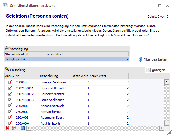 In der Vorbelegungstabelle wird das Stammdatenfeld, welches für die Umstellung gewählt wurde, angezeigt und kann mit einem neuen Wert versehen werden.