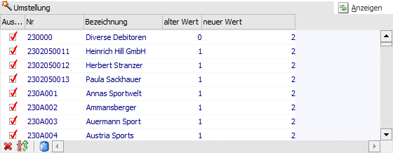 Durch Anwahl des Buttons "Anzeigen" wird die Änderungstabelle (unter Berücksichtigung des Filters) mit allen existierenden Stammdatensätzen des gewählten Typs gefüllt und die Spalte "neuer Wert" mit dem Wert der Vorbelegungstabelle versehen.