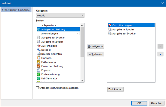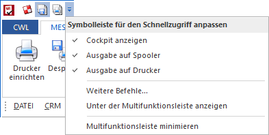 Nach Anwahl dieses Eintrags öffnet sich das Fenster "cwlstart". In diesem können Buttons / Funktionen aus unterschiedlichsten Ribbons dem Schnellzugriff hinzugefügt werden.