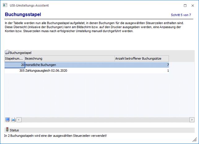 In der Tabelle werden alle Buchungsstapel aufgelistet, in denen Buchungen für die ausgewählten Steuerzeilen vorhanden sind. Pro Buchungsstapel wird die Anzahl der betroffenen Buchungen angezeigt.