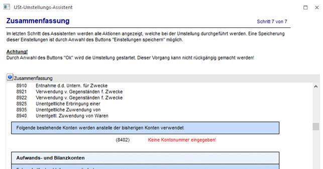 Wurden Fehler erkannt, die eine Umstellung verhindern, werden diese in rot auf der Zusammenfassung ausgewiesen und die Umstellung kann nicht durchgeführt werden. Dann muss in den vorangegangenen Schritten die Korrektur der Fehler erfolgen, damit die Umstellung durchgeführt werden kann.