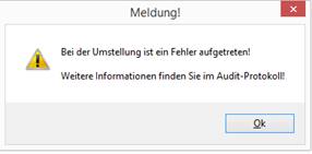 Sollte eine Umstellung nicht erfolgreich durchgeführt worden sein, kommt ein Hinweis auf das Audit. Mit Bestätigung der Meldung wird das Auditprotokoll geöffnet.