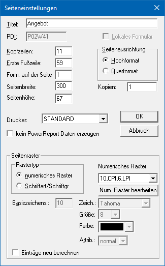 Die Wahl des Seitenrasters hängt von dem zu definierenden Formular ab. In der Regel erlaubt eine kleinere Rasterung eine genauere Positionierung. Um Überschneidungen zu vermeiden, sollten Rasterung und verwendete Fonts allerdings korrelieren. Für das Bedrucken/Nachdrucken von Formularen (z.B. Umsatzsteuervoranmeldung) empfiehlt sich eine sehr feine Rasterung.