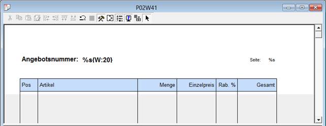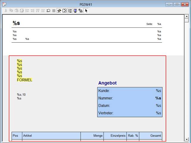 In einem Angebotsformular ist hinterlegt, dass der Kopfbereich 11 Zeilen hoch ist. Auf der ersten Seite (Flag "A") müssen aber noch mehr Information im Kopf platziert werden. Bei der Ausgabe wird dieses automatisch vom Programm bedacht und der Mittelteil beginnt erst ab der ersten freien Zeile (hier "Zeile 35").