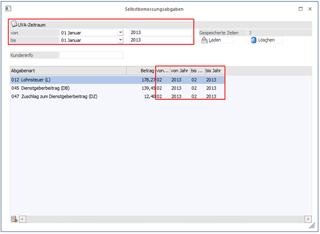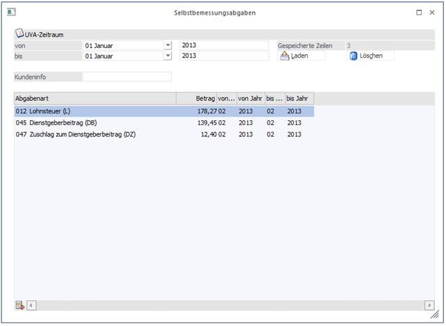 Wird ein UVA-Zeitraum angegeben, für den es bereits gespeicherte Zeilen gibt, steht der Button "Laden" zur Verfügung. Es gibt zwei Arten, wie gespeicherte Zeilen entstehen können.