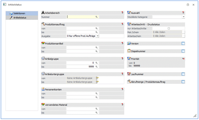 Welche Produktionsartikel sollen bearbeitet werden. Wird eine Einschränkung vorgenommen, dann wird neben dem Eingabefeld die Artikelbezeichnung angezeigt. Durch einen Klick auf die Bezeichnung kann eine Drill-Down-Funktion ausgelöst werden. Welche Aktion dabei ausgelöst wird, kann über die rechte Maustaste festgelegt werden (die letzte Einstellung wird gespeichert), wobei folgende Optionen zur Verfügung stehen: