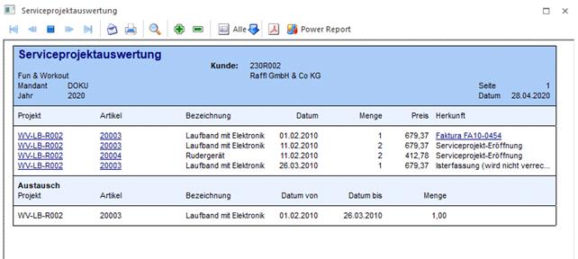 Es werden alle Belegzeilen (Lieferscheine oder Fakturen) und alle Projektjournalzeilen (Eröffnung sowie Isterfassung) der Artikel mit Kennzeichen "Serviceartikel" angezeigt.