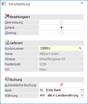 Wählen Sie den Menüpunkt an und geben Sie die Lieferantennummer ein. Dann wählen Sie die gewünschte Zahlungsart, entscheiden von welcher Hausbank die Überweisung getätigt werden soll und ob der Geschäftsfall sofort automatisch gebucht werden soll.