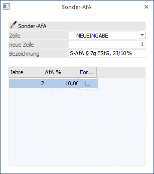 Um eine gleichbleibende Normal-AfA während des Begünstigungszeitraumes zu erhalten, müssen alle 5 Jahre in der Staffel aufgenommen werden. Die Jahre, für die keine Sonder-AfA während des Begünstigungszeitraumes genutzt wird, werden mit 0 % hinterlegt.