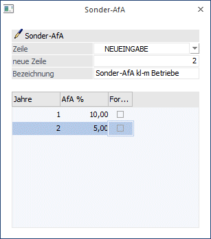 Die Eingabe 2 / 5 würde bedeuten, dass in den ersten beiden Jahren jeweils 5 % Sonder-AfA geltend gemacht werden.