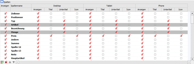 In der Tabelle werden alle Spalten der Bildschirmtabelle dargestellt. Handelt es sich um eine Muss-Spalte, so weist diese eine graue Hinterlegung auf. Für die Darstellung Desktop / Tablet / Phone kann jeweils definiert werden, welche Informationen als Titel, Untertitel und Icon in der WinLine mobile dargestellt werden sollen.
