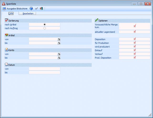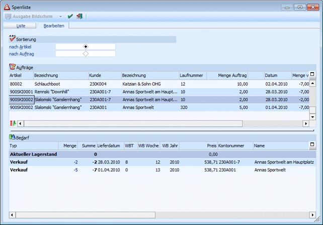 Die Sperrliste kann sortiert nach Artikel oder nach Auftrag ausgegeben werden