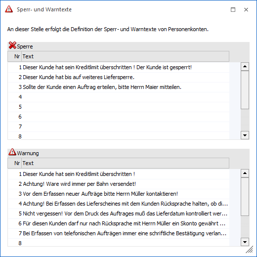Der Kunde kann weder bebucht noch können für den Kunden Belege erfasst werden. Sobald ein Sperrtext eingetragen ist, werden die Kreditlimitbeträge nicht berücksichtigt.