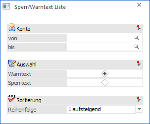 Mit Hilfe dieser Auswahl kann definiert werden, ob eine Auswertung über die Warn- oder die Sperrtexte erzeugt werden soll.