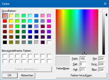 Sobald ein Spezialfont definiert wurde, steht diese Funktion zur Verfügung. Bei Anwahl wird das Fenster "Farbe" geöffnet, in welchem die Farbe individuell designed werden kann.