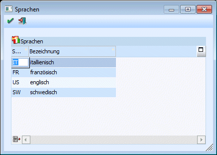 In der ersten Spalte der Tabelle wird das bis zu fünfstellige Sprachkennzeichen eingegeben, in der zweiten Spalte wird der Langtext hinterlegt.