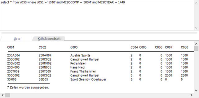 Durch Anklicken des Ausführen-Buttons oder durch Drücken der F5-Taste bzw. der Tastenkombination ALT + E wird die Abfrage gestartet, wobei das Ergebnis in der zuvor gewählten Form (Liste oder Kalkulationsblatt) ausgegeben wird.