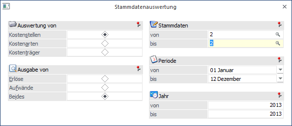 Durch Eingabe von Stammdatennummern wird die Ausgabe eingeschränkt. Wird die Auswahl ohne Eingabe übergangen, werden automatisch alle Stammdaten ausgewertet.