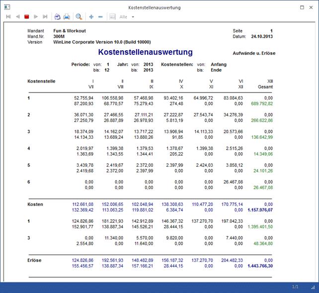werden pro Kostenstelle/Kostenart/Kostenträger einzelne Periodenwerte und die Gesamtsumme der Kosten/Erlöse ausgegeben.