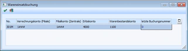 Auf dieses Konto werden die Warenbestände der Zentrale gebucht. Das Konto wird durch die Warenbestandsbuchung der Filiale vorbelegt. Durch die Eingabe des Zeichens # kann die Vorbesetzung übernommen werden. Teile der Vorbesetzung können übersteuert werden. Details entnehmen Sie dem Kapitel Belegarten FAKT der Standarddokumentation. Das Konto muss in der Zentrale angelegt sein. Das Wareneinsatzkonto wird von der Filialbuchung übernommen.
