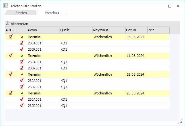 Mit dem Vorschau-Button können vor dem Start der Berechnung der Termine kontrolliert werden.