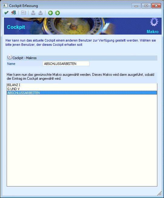 Damit ein Makro im Cockpit hinterlegt werden kann, sind folgende Schritte durchzuführen: