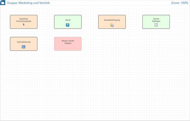 Innerhalb der Übersicht werden die einzelnen Objekte (Startschritte und CRM-Aktionen) zur besseren Unterscheidung farblich gekennzeichnet. Zusätzlich steht im Bearbeitungsmodus ein Objekt zur Anlage eines neuen Schritts (d.h. zur Anlage eines neuen CRM-Prozesses) zur Verfügung.