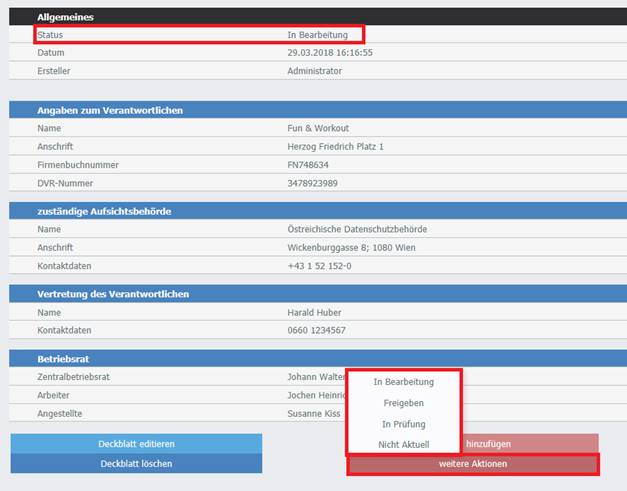 Um den Status zu ändern, muss auf "weitere Aktionen" geklickt werden. Es kann aus allen verfügbaren Stati gewählt werden. Jeder Status ist ein Workflow Schritt.