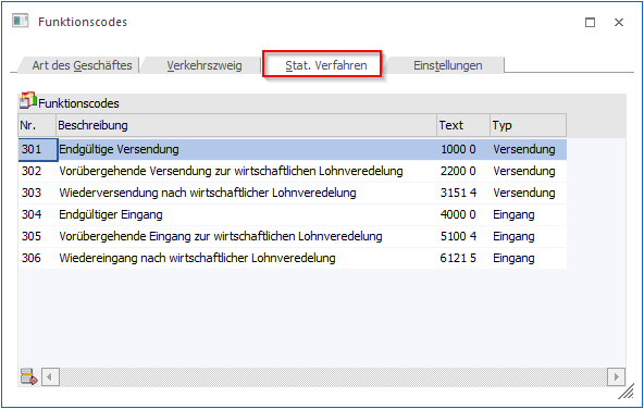 In dem Register "Stat. Verfahren" werden die Codes für das Statistische Verfahren hinterlegt.