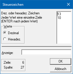 Über die Option "Werte" kann definiert werden, ob die Eingabe in Form von dezimalen oder hexadezimalen Zeichen erfolgen soll (siehe Feld "Dez. oder hexadez. Zeichen").