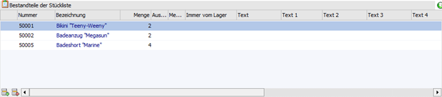 In der Tabelle werden die Bestandteile der Stückliste, auch "Komponenten" genannt, hinterlegt. D.h. was wird benötigt, um 1x die Handels- bzw. die Fertigungsstückliste herzustellen.
