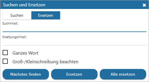 Bei Anwahl dieses Buttons öffnet sich zunächst ein Auswahlmenü, über welches definiert werden kann, ob nach einem Begriff nur "gesucht" oder "gesucht und ersetzt" werden soll. Die hierfür notwendige(n) Eingabe(n) erfolgt über das Fenster "Suchen und Ersetzten", in welchem zwischen den Funktionen jederzeit über die Register gewechselt werden kann.