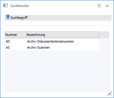 Wenn der Fokus in dem Feld "Nummernkreis" liegt und das Lupen-Symbol bzw. die Taste F9 gedrückt wird, dann öffnet sich das Programm "Suchfenster". An dieser Stelle kann nach bereits angelegten Archiv-Nummernkreisen gesucht werden.