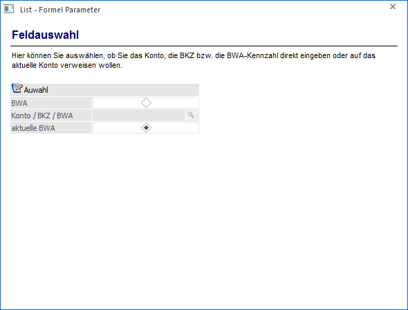 Mit dieser Funktion kann ein Wert einer BWA abgeholt werden, wobei hier verschiedene Einstellungen vorgenommen werden können, die in mehreren Schritten definiert werden können.