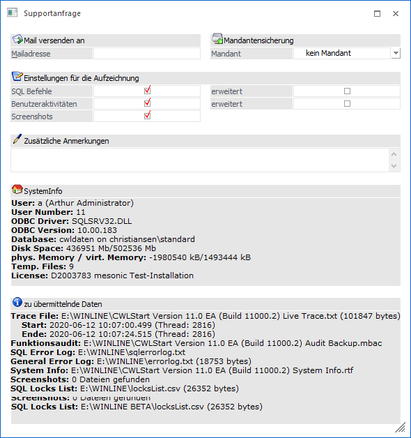 "CWLStart Version 11.0 (Build 11000) System Info.rtf". Ist eine Mailadresse hinterlegt, so wird bei Betätigen des Buttons "Ok" der Versand ausgeführt.