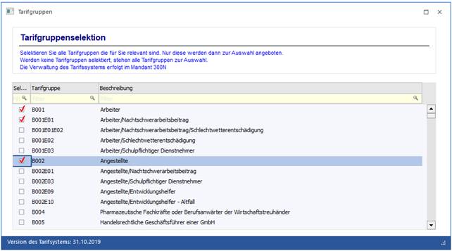 Wird eine Checkbox der Spalte Selektion aktiviert, dann steht diese Tarifgruppe im Arbeitnehmerstamm bei den Beschäftigungen zur Auswahl zur Verfügung. Wird keine einzige Checkbox aktiviert, dann stehen generell alle Tarifgruppen im Arbeitnehmerstamm zur Verfügung