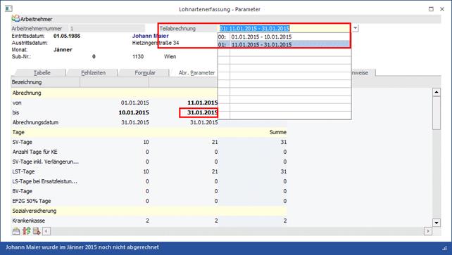 Werden im Arbeitnehmerstamm mehrere Beschäftigungen angegeben, die innerhalb derselben Periode starten, so wird automatisch eine Teilabrechnung erstellt.