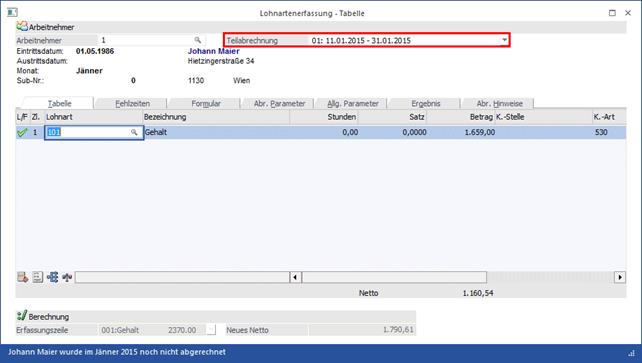 Mittels Teilabrechnungen können innerhalb einer Periode mehrere Abrechnungen durchgeführt werden. Dies wird zum Beispiel benötigt, wenn ein Lehrling innerhalb der Periode das Lehrjahr und somit die Tarifgruppe wechselt, oder auch "Fallweise Beschäftigte" können so abgerechnet werden.