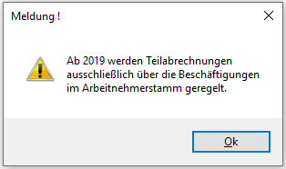 Mittels Teilabrechnung entfernen Button kann eine bereits erstellte Teilabrechnung wieder gelöscht werden. Dies ist nur in den Abrechnungsjahren bis einschließlich 2018 möglich. Bei einer Abrechnung die das Jahr 2019 oder höher betrifft, erhalten Sie folgende Meldung: