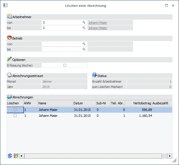 Beim Löschen einer Abrechnung werden pro Arbeitnehmer auch alle Teilabrechnungen angezeigt. Es können immer nur alle Teilabrechnungen gemeinsam gelöscht werden. Eine Einzelselektion der Teilabrechnungen ist nicht möglich.